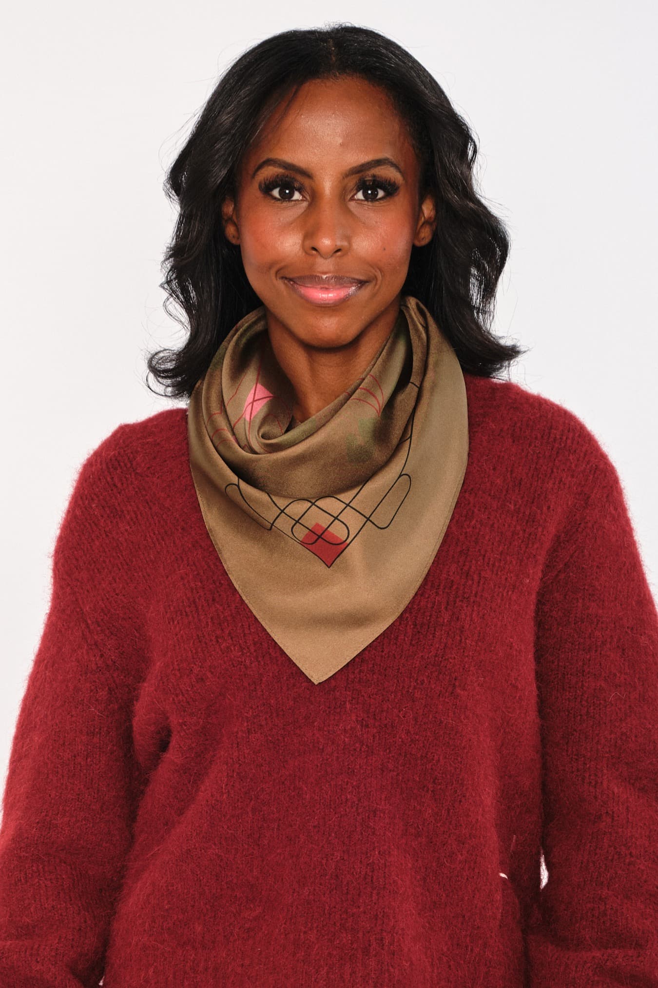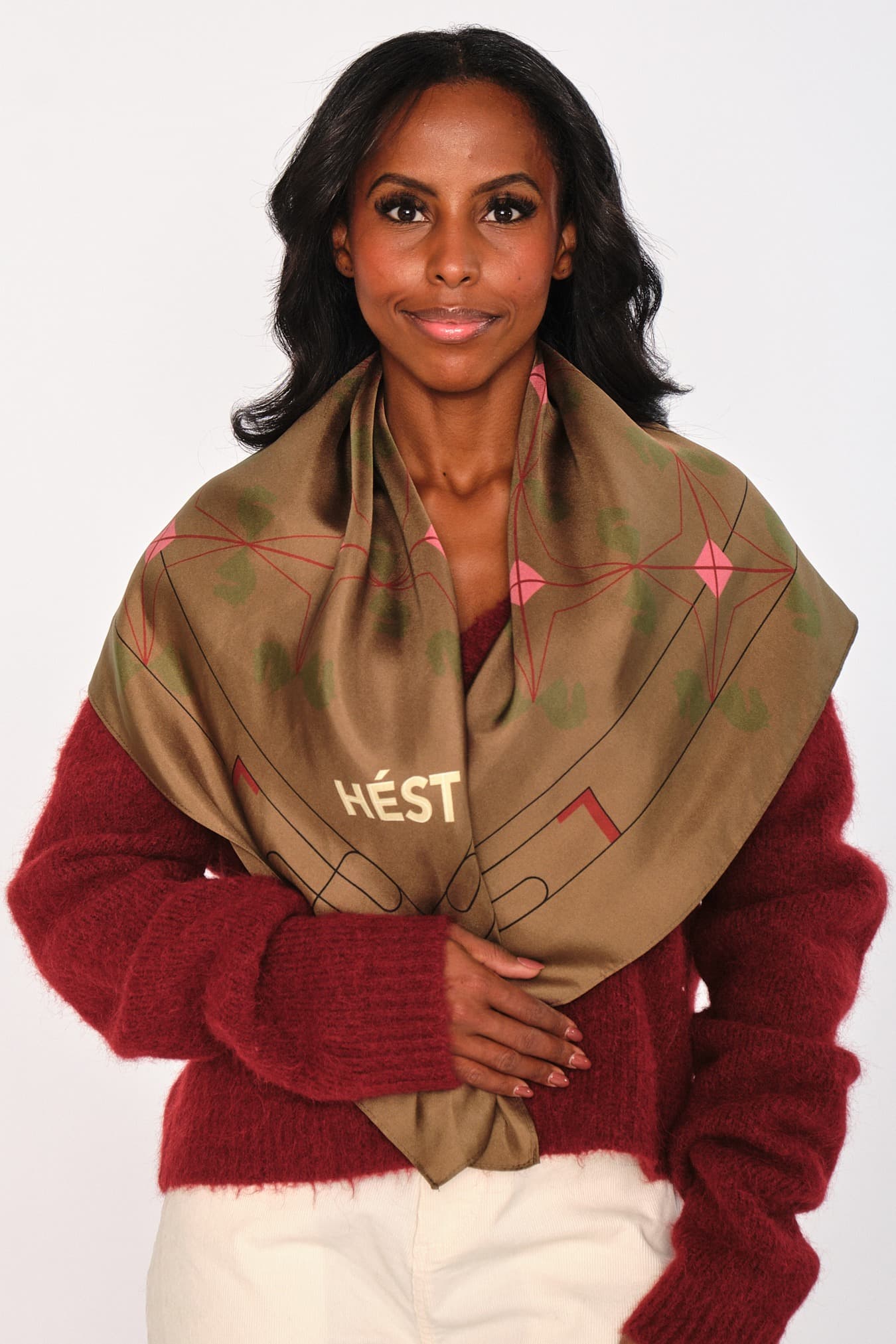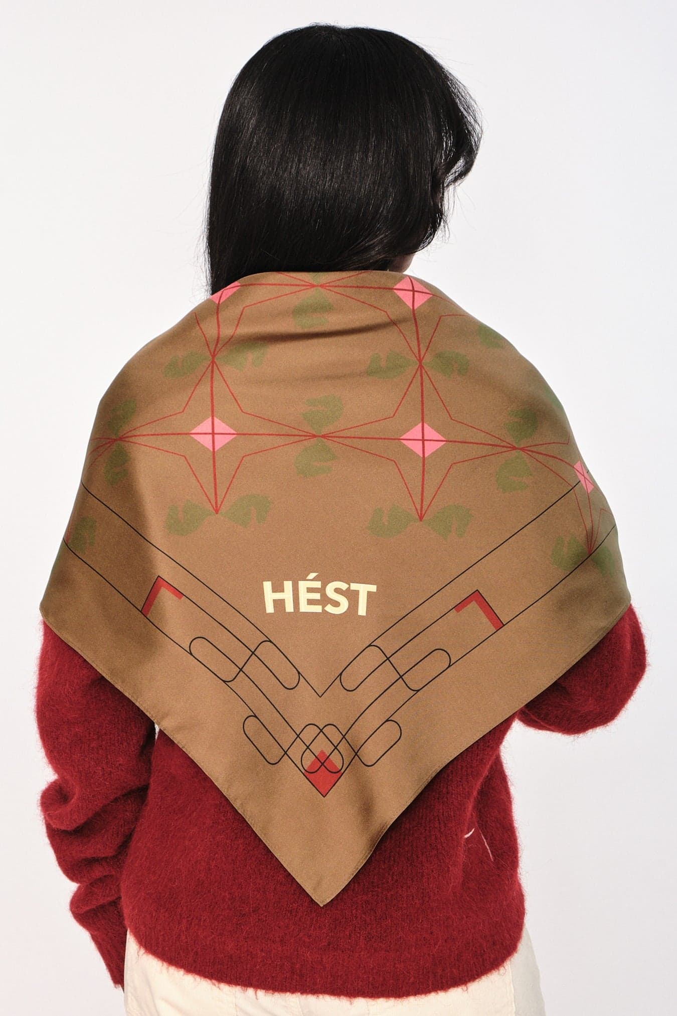 Eliza Silk Scarf Large er laget av 100 % silke med heldekkende print av hester og abstrakte former. Måler 90×90 cm – perfekt å drapere, knyte eller bruke som lag-på-lag. Et luksuriøst statement som gir antrekket en elegant finish.