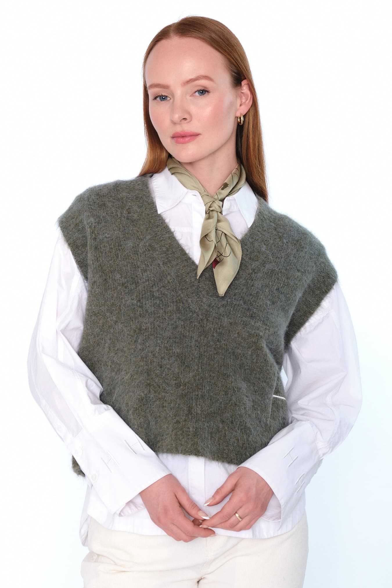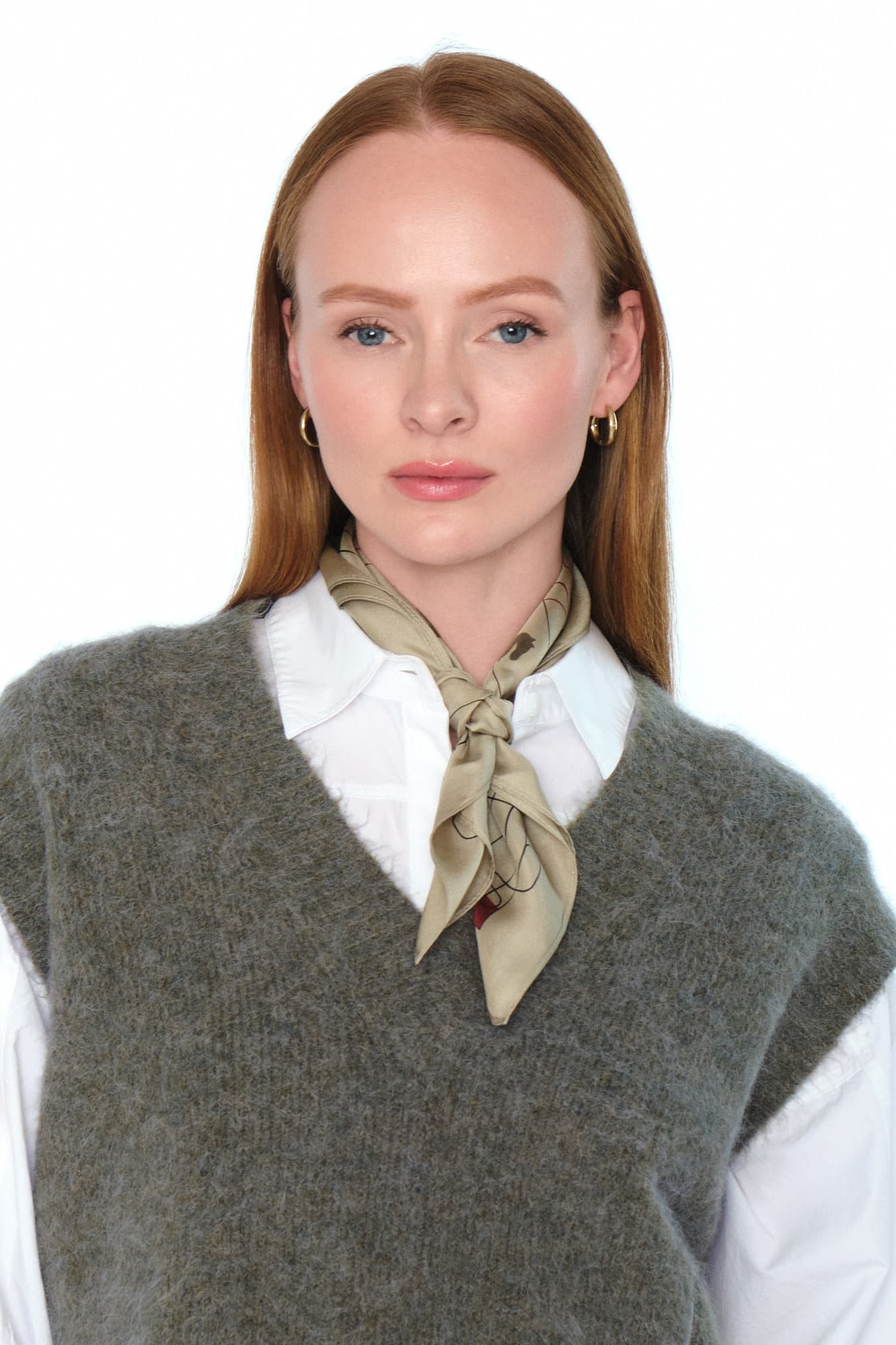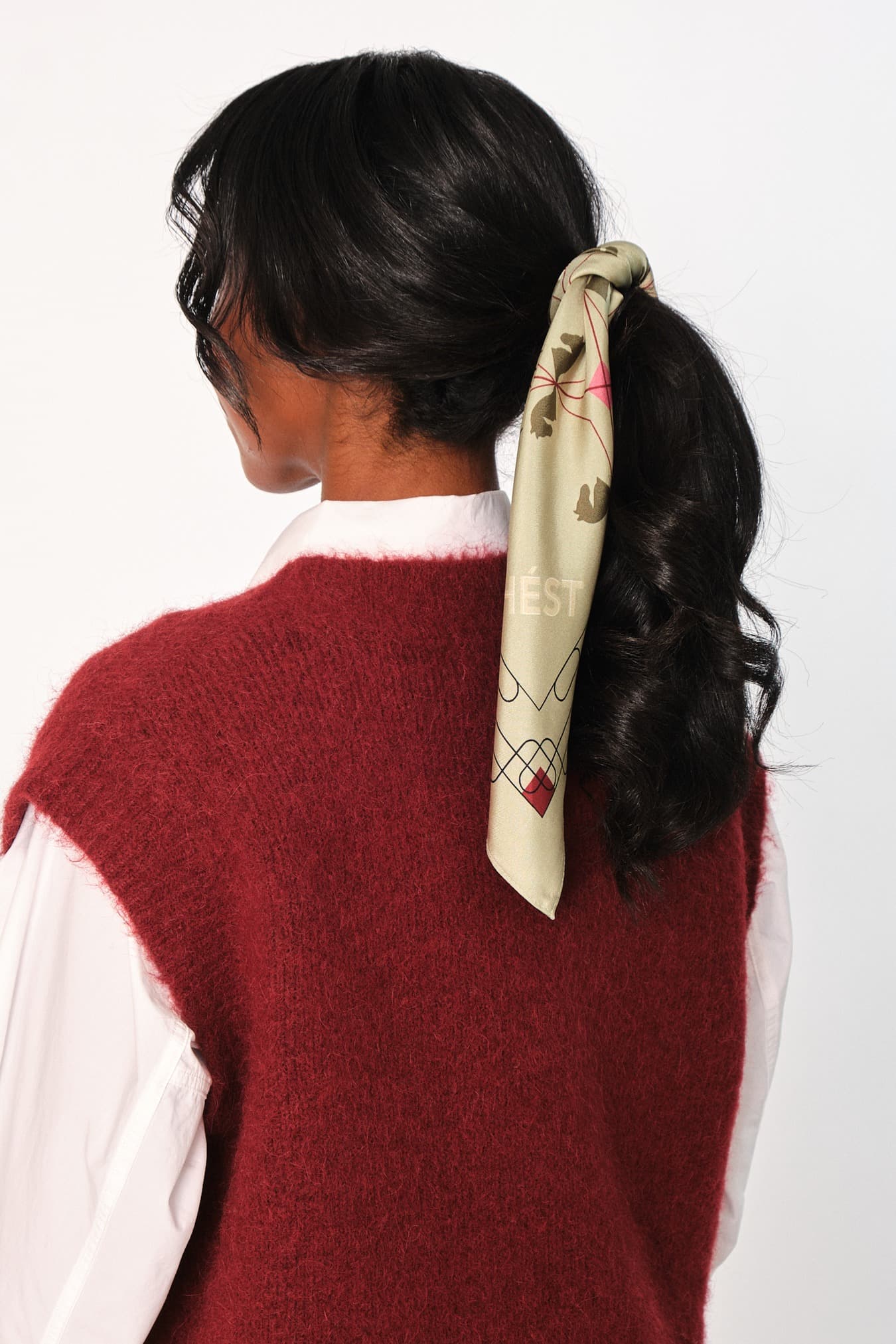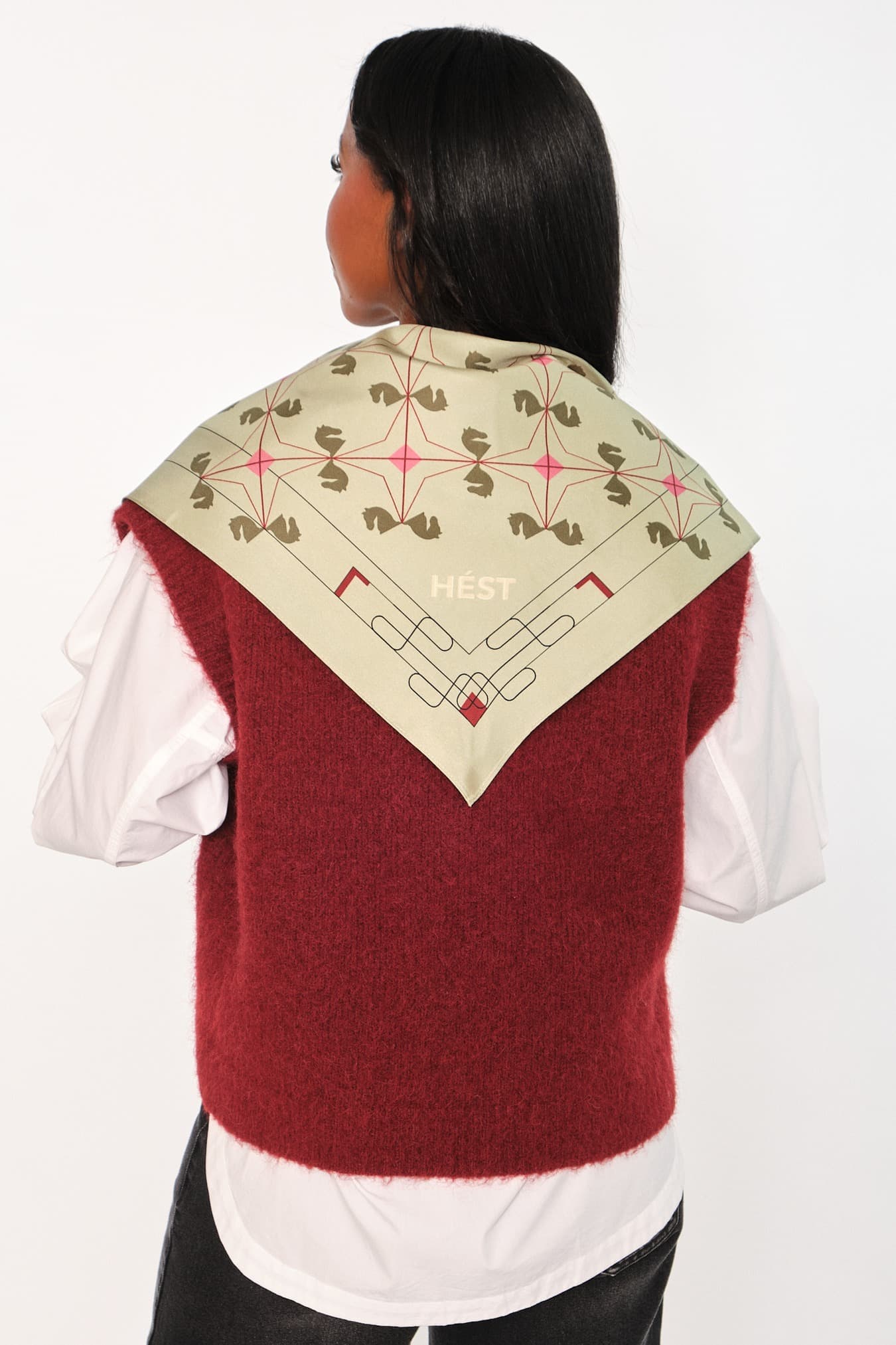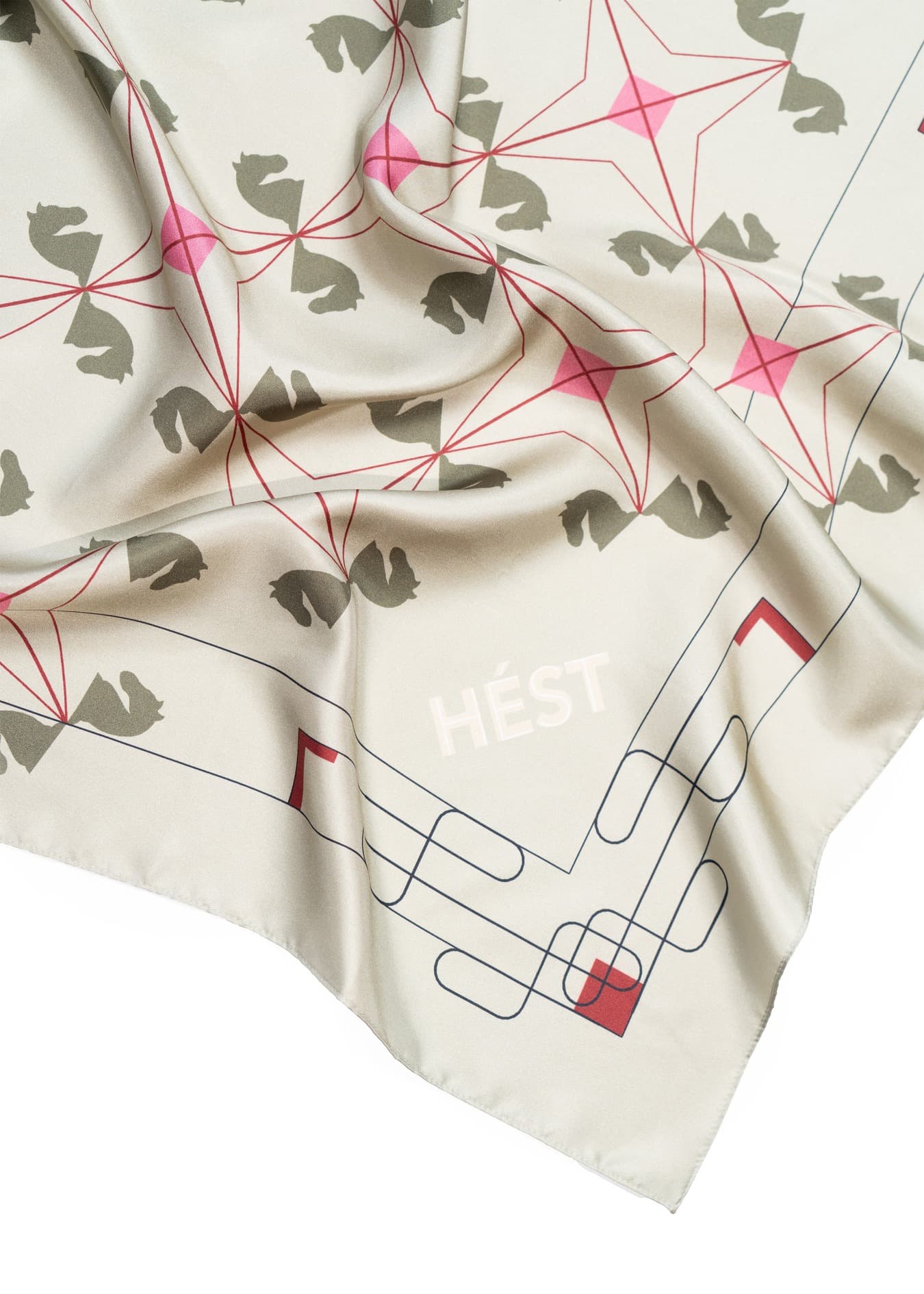 Eliza Silk Scarf Small er laget av 100 % silke med heldekkende print av hester og abstrakte former. Måler 54×54 cm – perfekt rundt halsen, i håret eller på vesken. Et sofistikert tilbehør som løfter ethvert antrekk med eleganse.