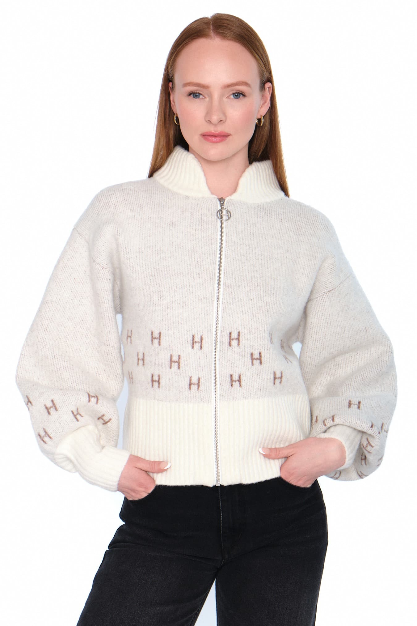 Utforsk vår korte strikkejakke med glidelås, høye ribber på ermene og nederst, og elegante H-logoer strikket inn i designet. Laget av en behagelig blanding av 30% ull, 15% alpakka, 30% akryl, 22% nylon og 3% elastan. Denne jakken gir både stil og komfort.
