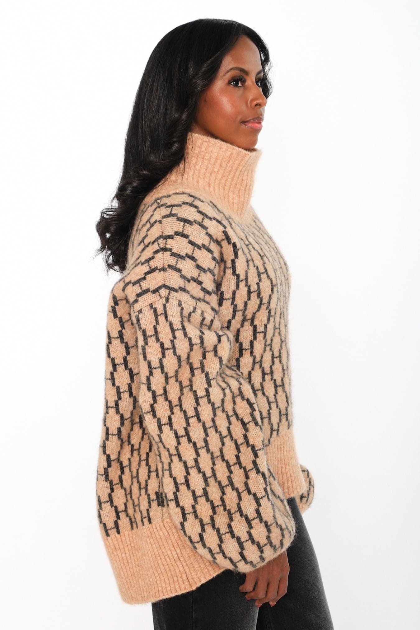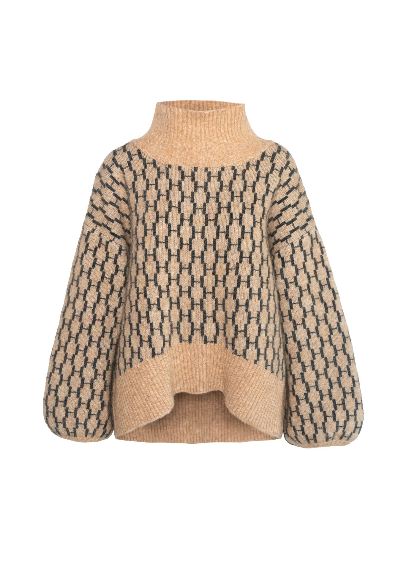 Fam New Pattern er en ny versjon av vår ikoniske Fam-genser, nå med heldekkende H-mønster. Den har en oversized passform med høy hals, vide ermer og lengre rygg for et avslappet, elegant fall. Strikket i en luksuriøs mohair–merino-blanding som gir både mykhet og stil i hverdagen.