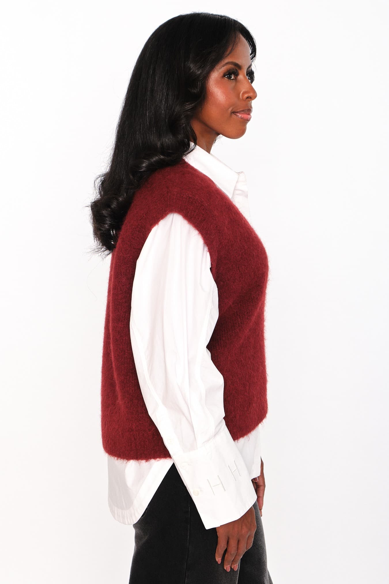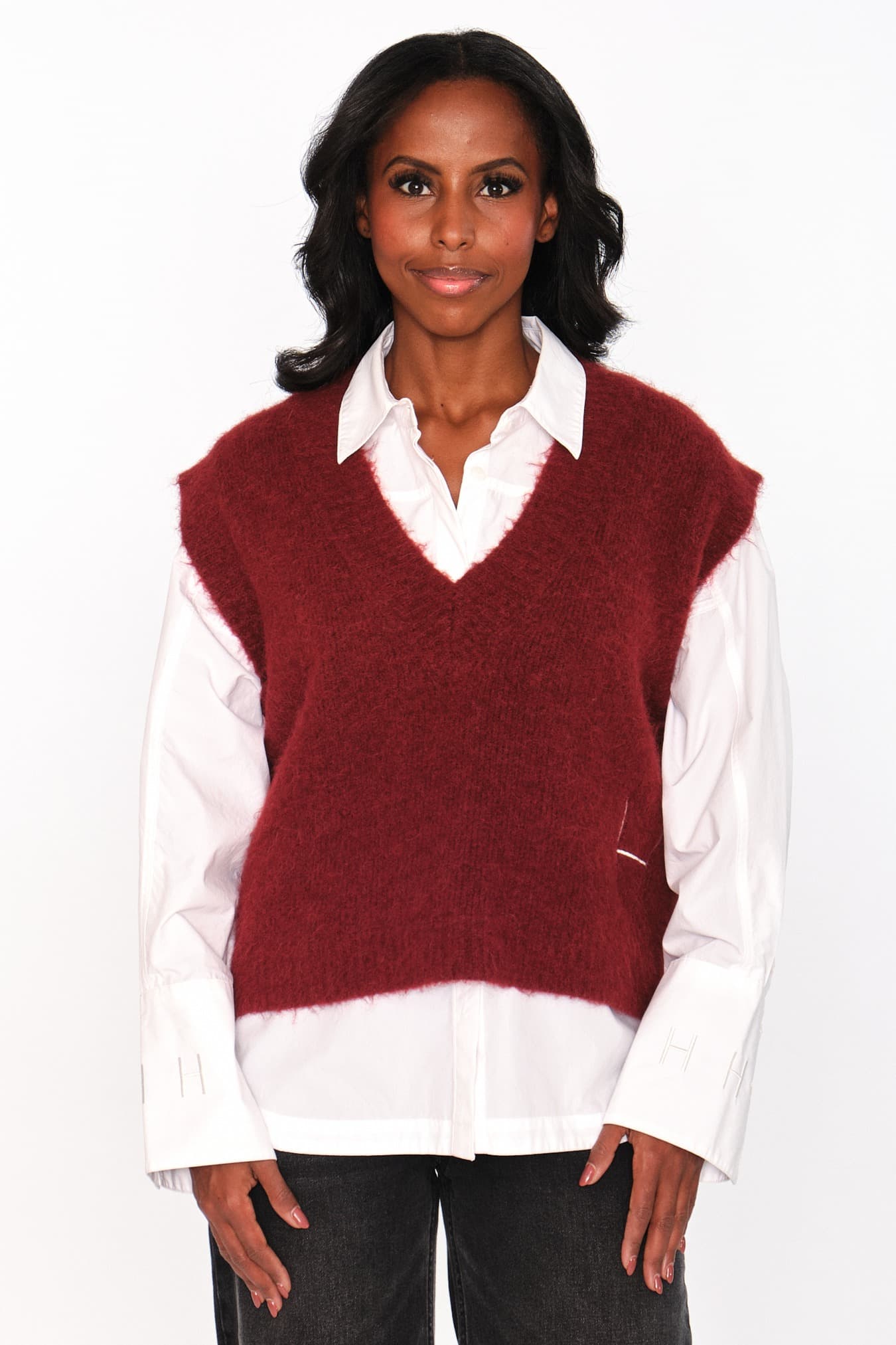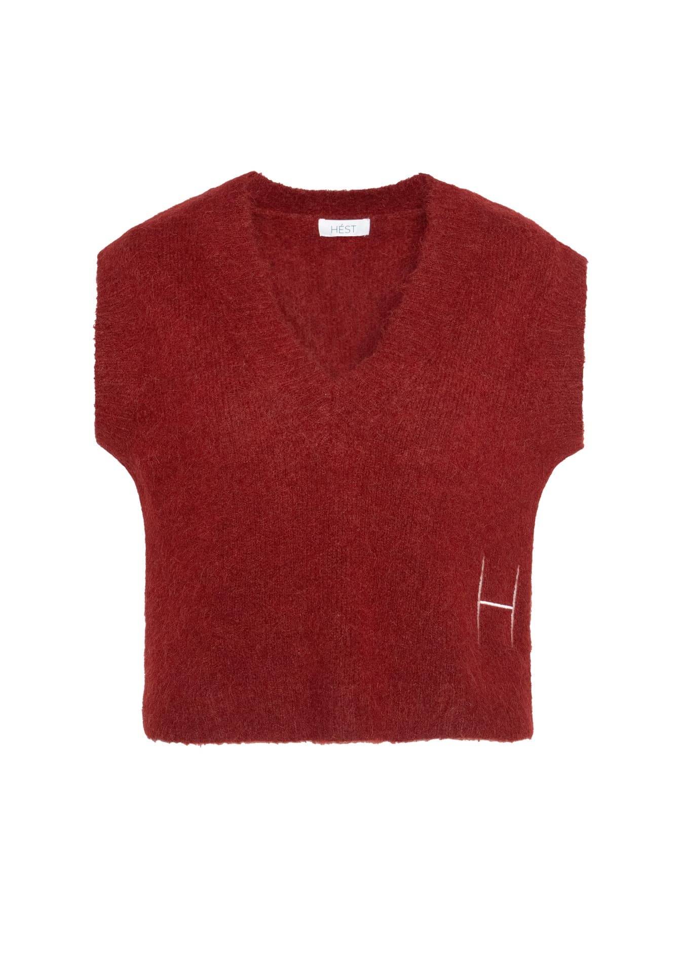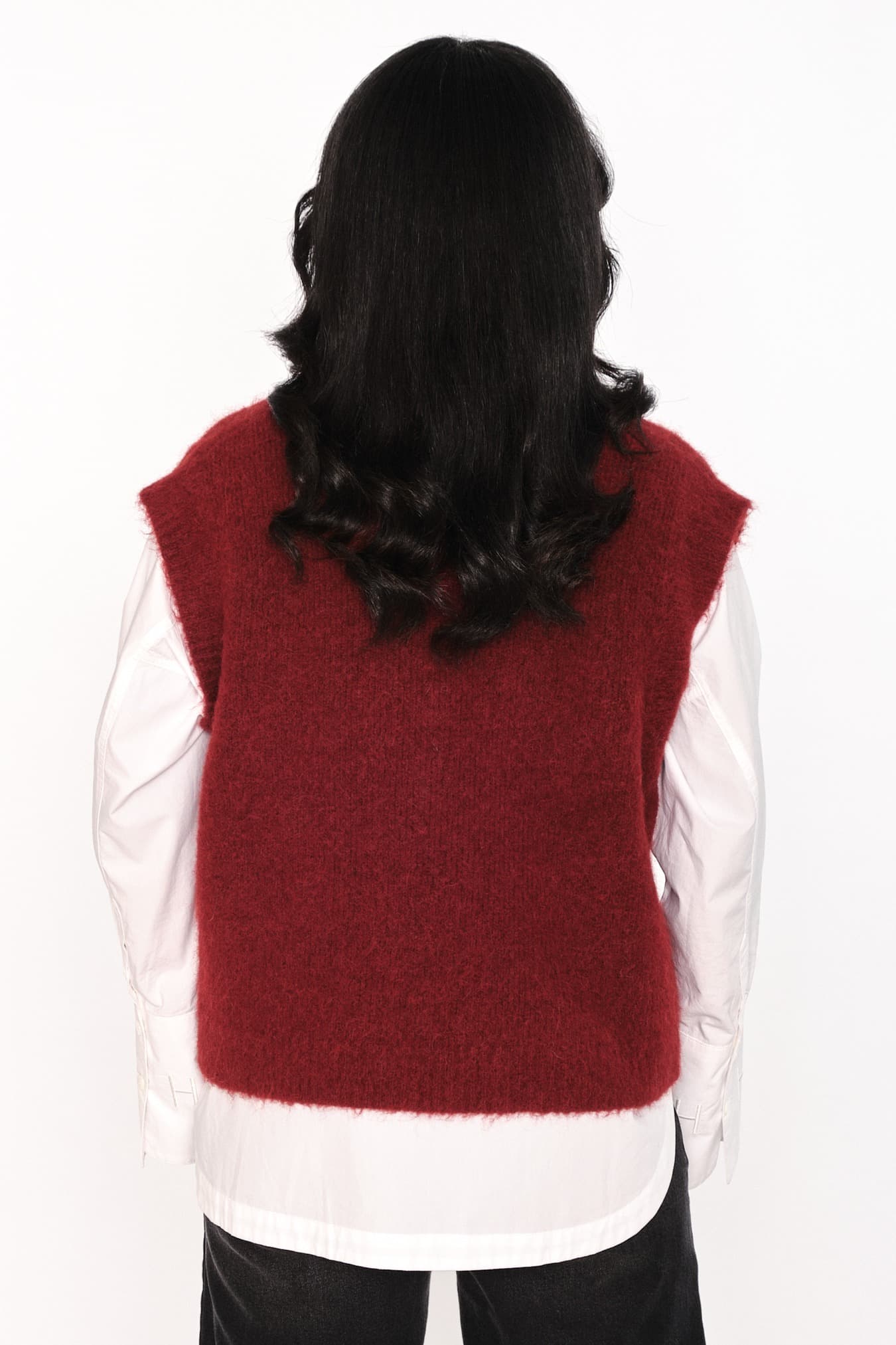 Denne avslappede vesten med V-hals er laget i en myk alpakka-blanding for en lun og behagelig følelse. Ribbestruktur og rå kanter gir et moderne og teksturert uttrykk. Et stilrent lag-på-lag-plagg som tilfører antrekket en oppdatert edge.