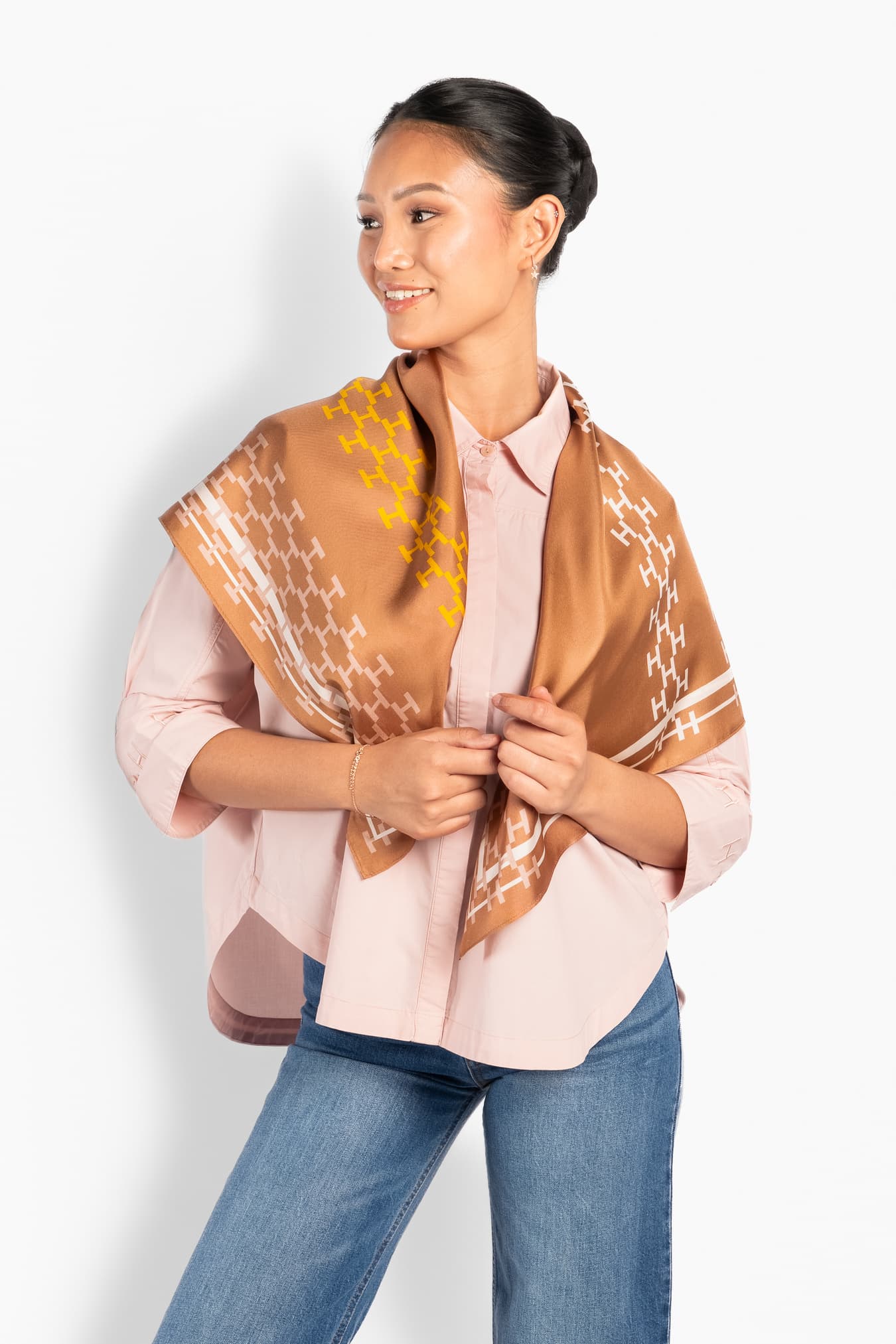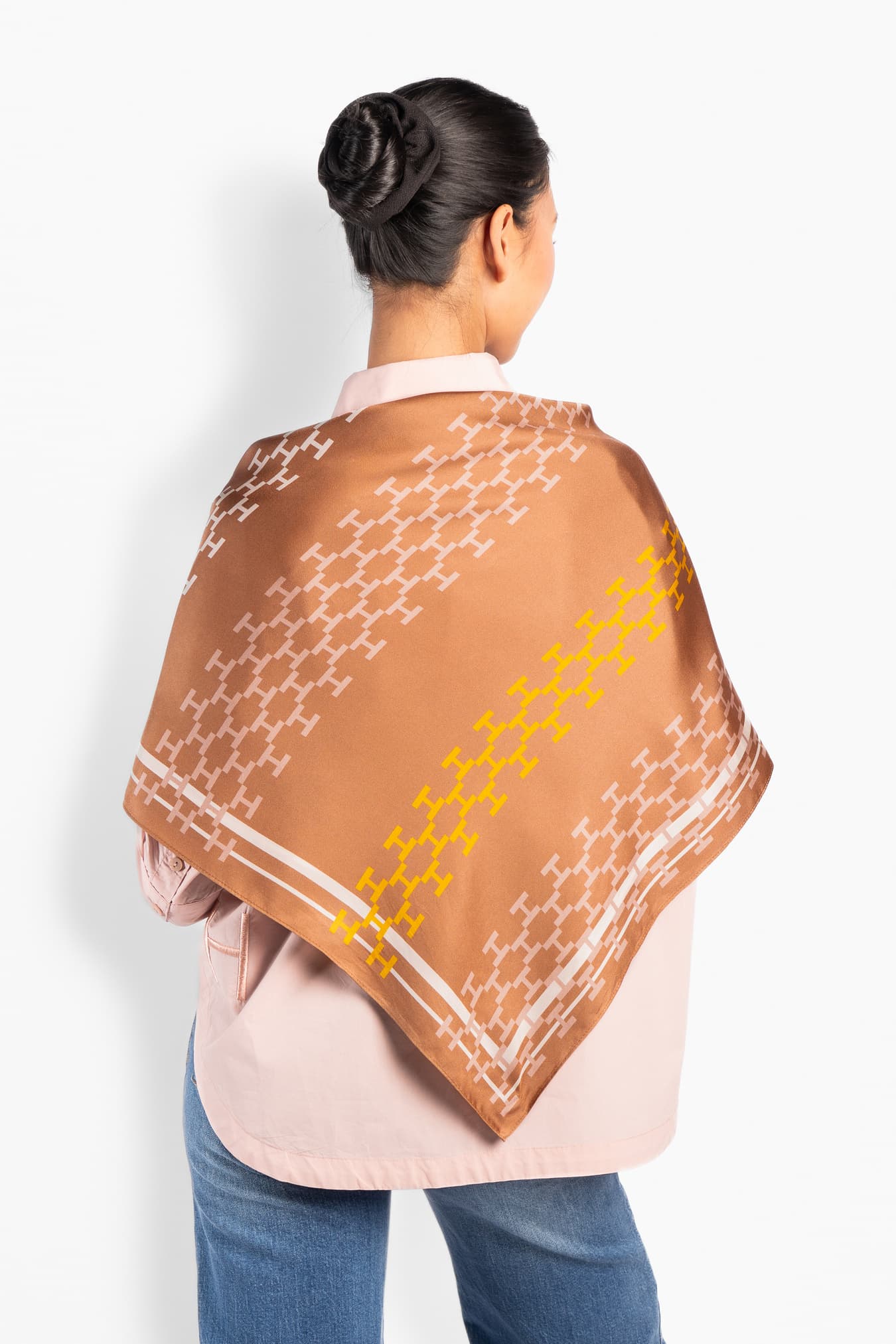 Isadora Silk Scarf er et elegant tilbehør laget i glatt, lett silke med et karakteristisk H-inspirert mønster og grafiske detaljer. Den generøse, kvadratiske formen gjør skjerfet allsidig og enkelt å style – bruk det rundt halsen, over skuldrene eller som en sofistikert detalj på vesken.