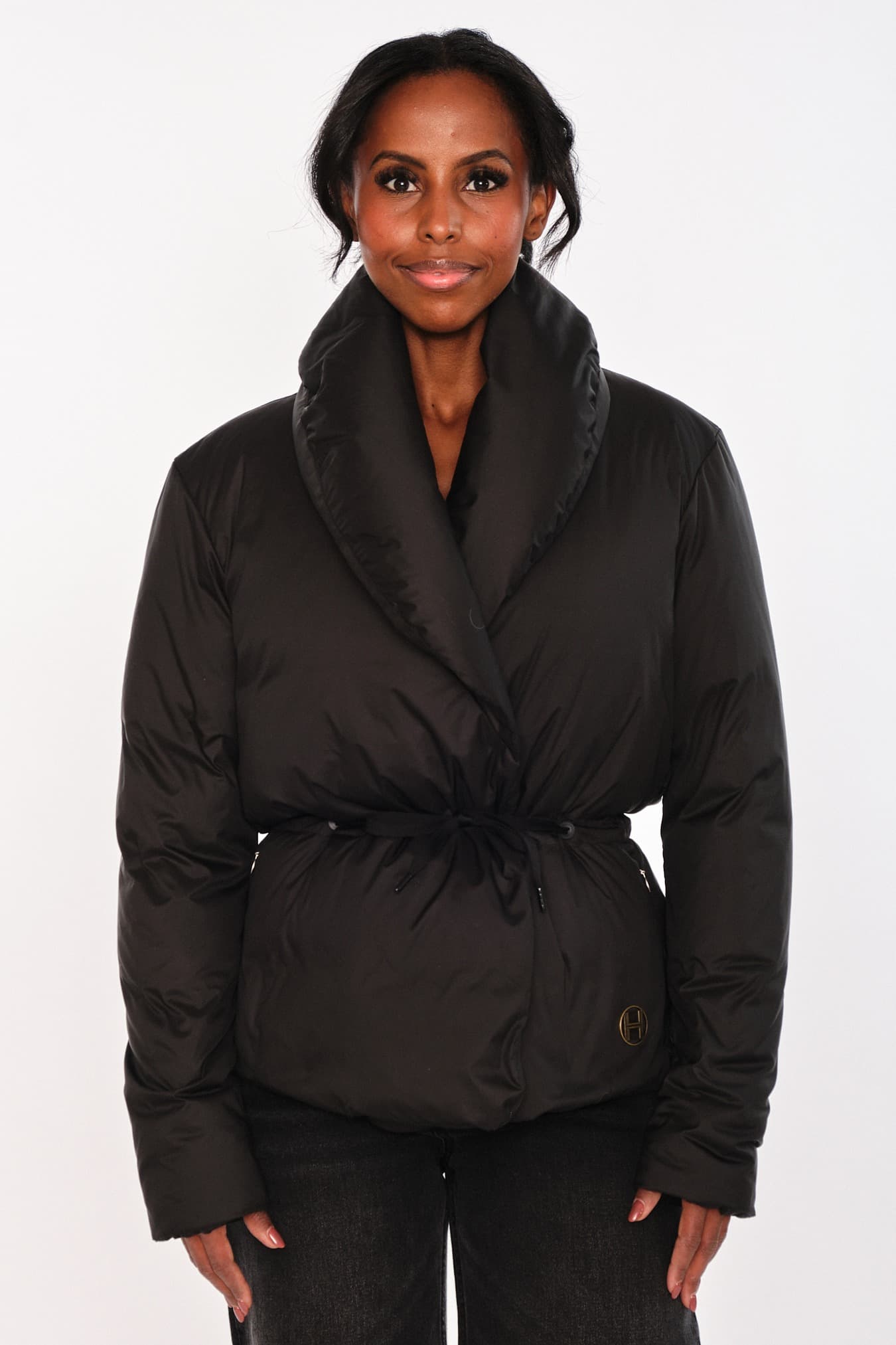 Veda Jacket har avslappet passform, sjalskrage og belte i livet, med metall-H-emblem nederst. Designet for enkel stil, og kombinerer sofistikasjon og komfort i en allsidig silhuett. Et tidløst plagg som løfter garderoben med diskret eleganse.