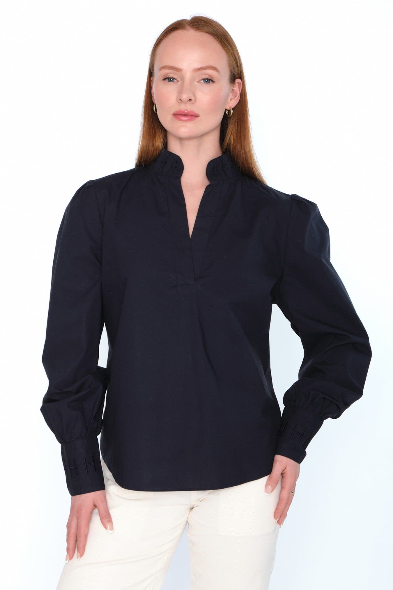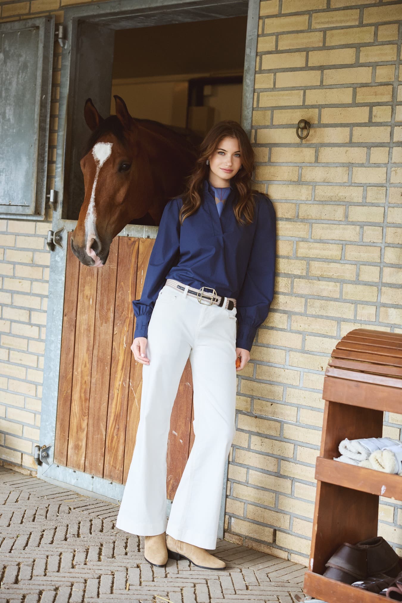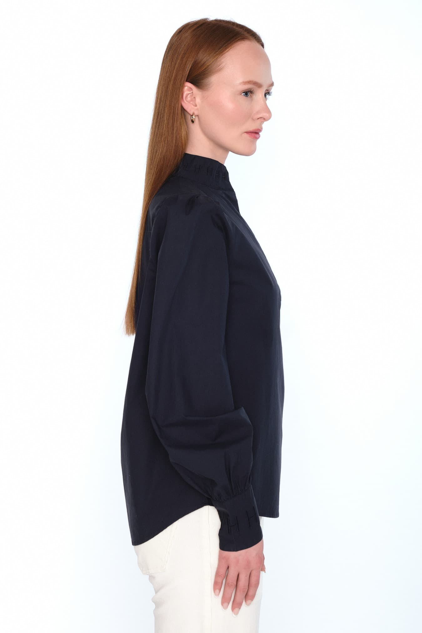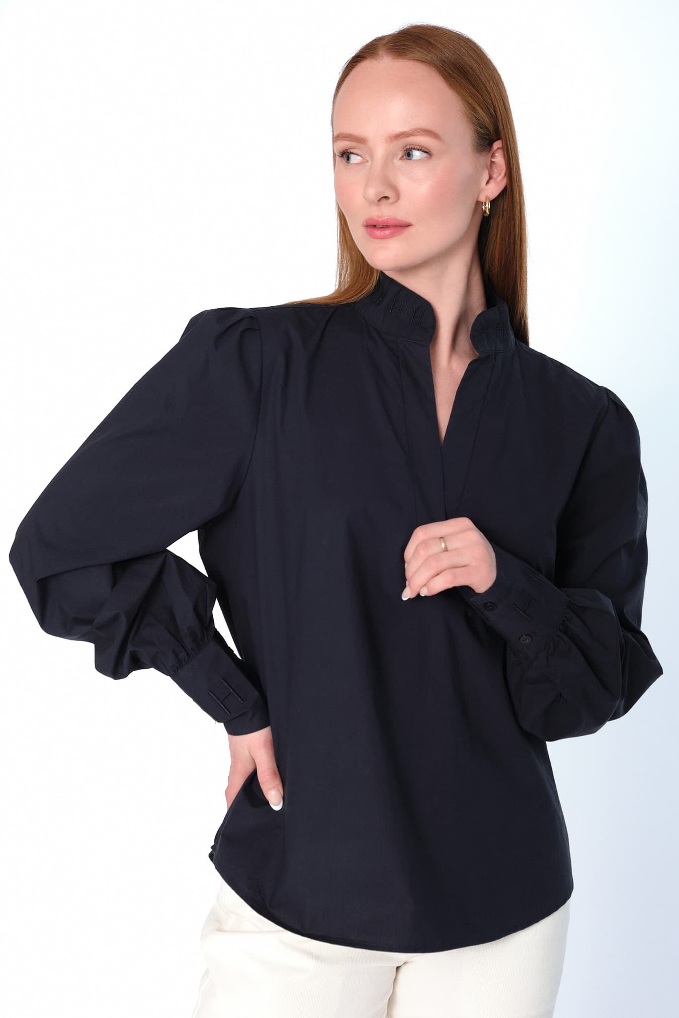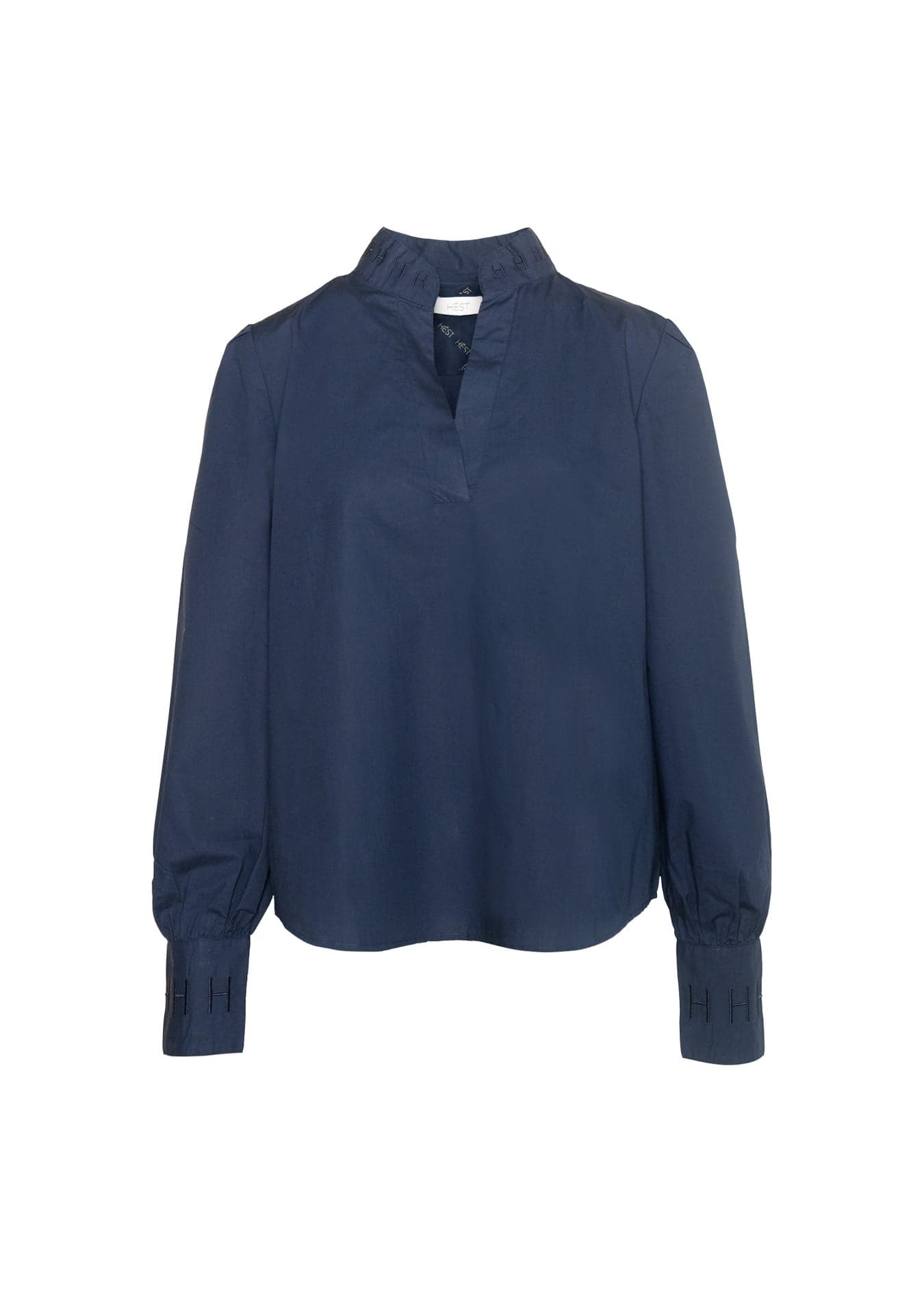 Mie Blouse er laget av 100 % bomullspoplin med mandarinkrage og mansjetter med diskret H-broderi. Med pop-over V-hals og puffede ermer får du en avslappet, men sofistikert silhuett. En nøye gjennomført topp som kombinerer enkel stil med komfort.