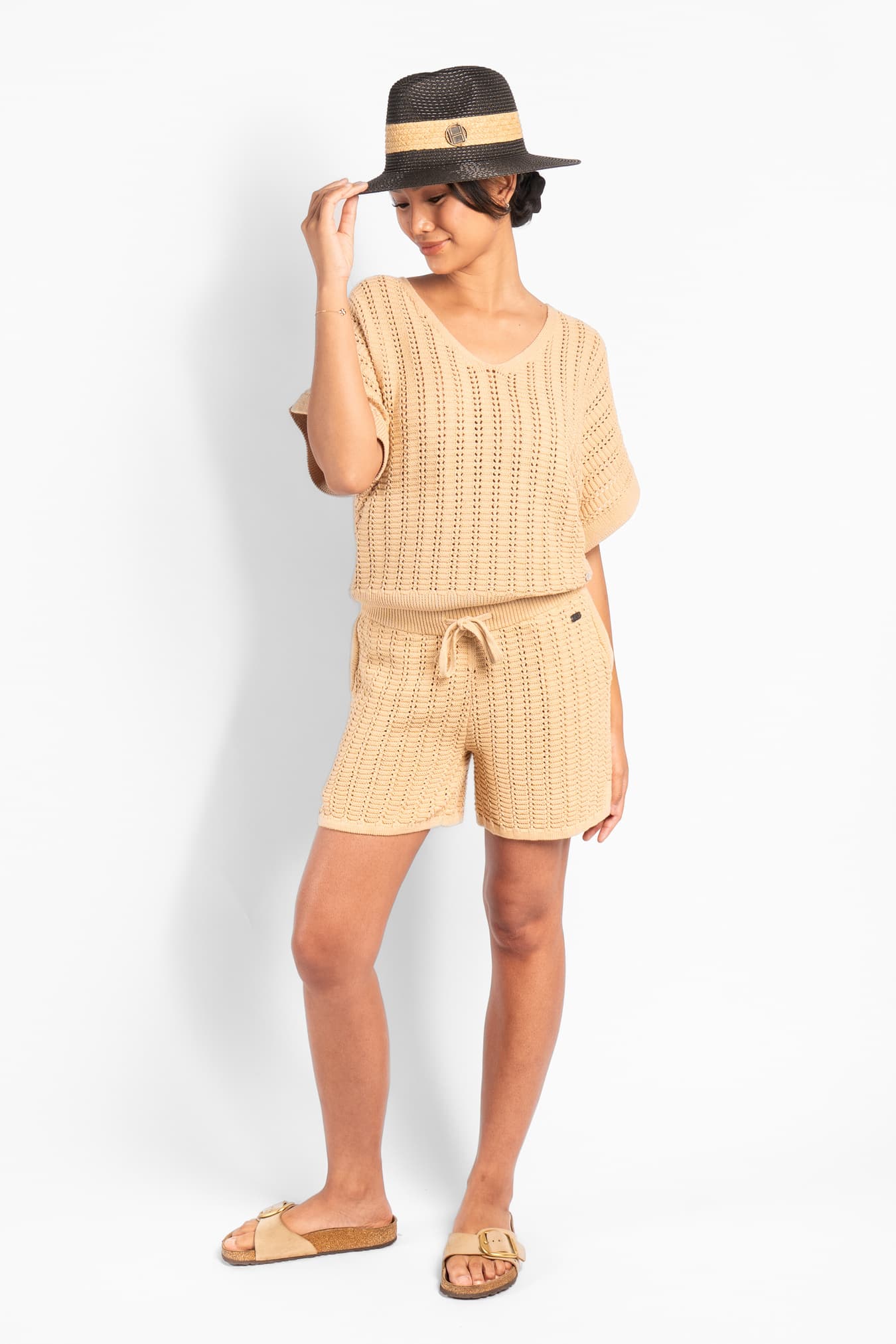 The Dahlia Top is designed with a relaxed silhouette and a soft, textured knit. Crafted from a cotton and linen blend, it offers a breathable feel with a naturally structured finish. Featuring a V-neckline and short sleeves, the open-knit pattern adds subtle depth and a light, airy expression. Style it with the matching Dahlia shorts for a coordinated and modern summer look.