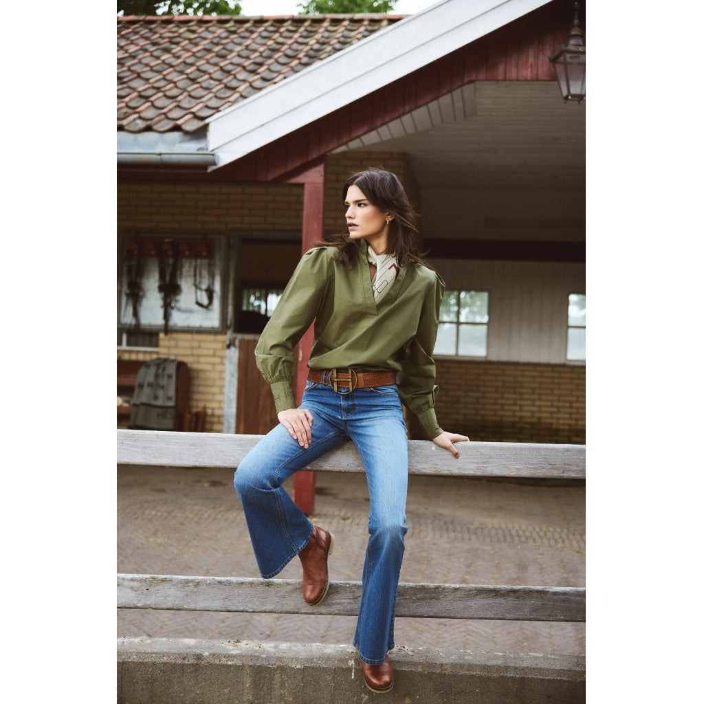 Its pop-over V-neck and puffed sleeves create a relaxed yet sophisticated silhouette.
