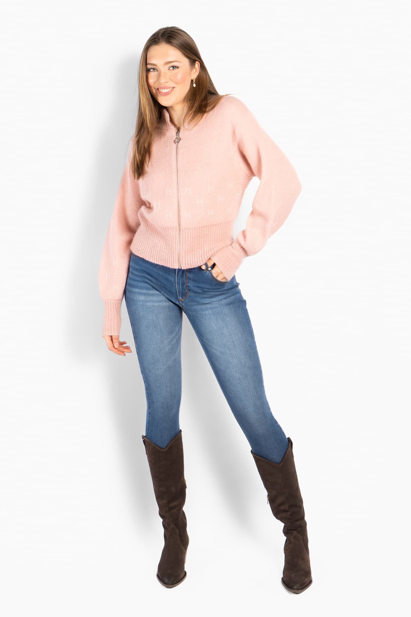 Märtha Jacket er en kort strikkejakke med glidelås og høye ribbekanter nederst og på ermene. Silhuetten er definert og feminin, med diskrete H-logoer strikket inn i mønsteret som gir et raffinert uttrykk. Strikket i en myk ullblanding med innslag av kid mohair, for lett struktur og tidløs eleganse.
