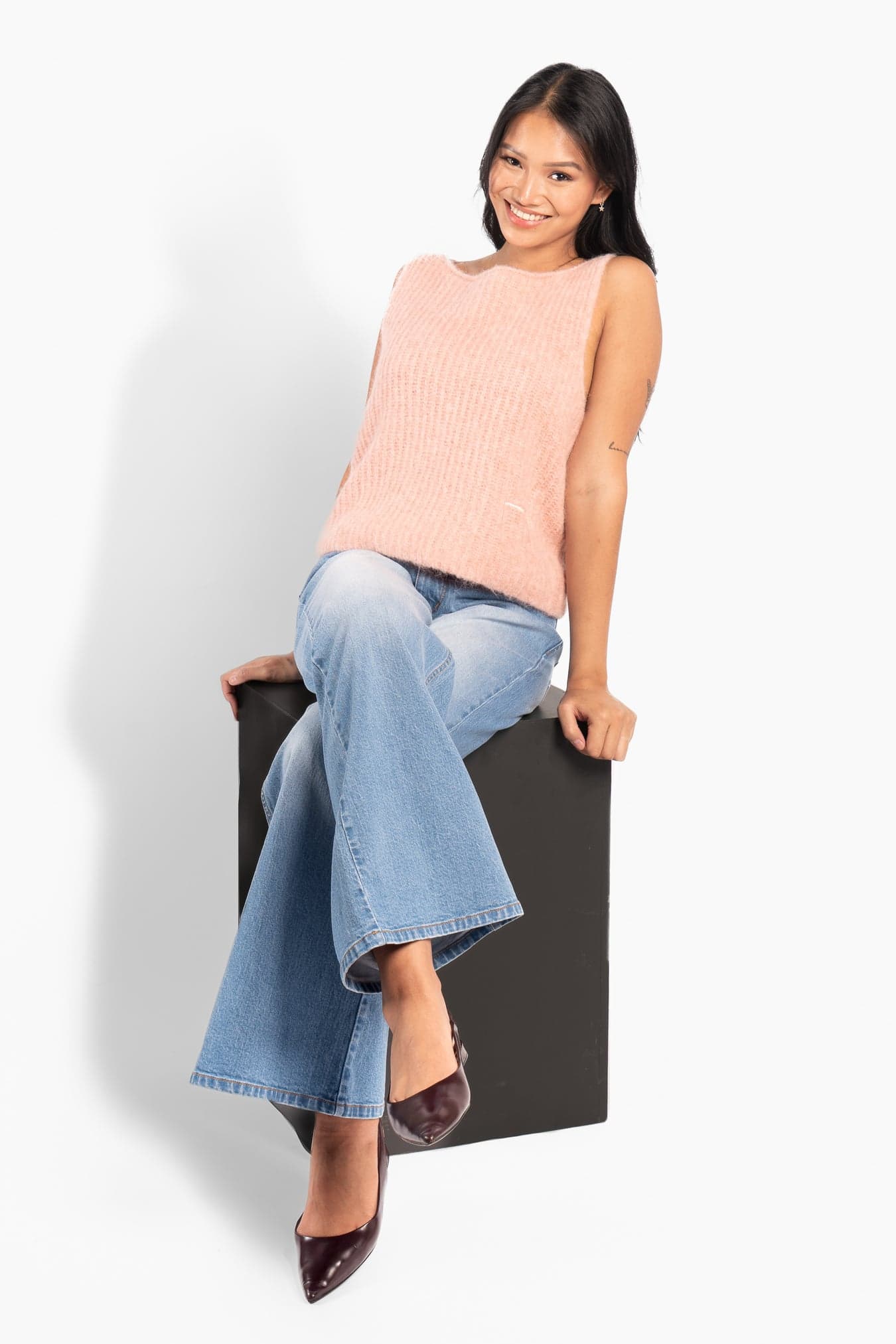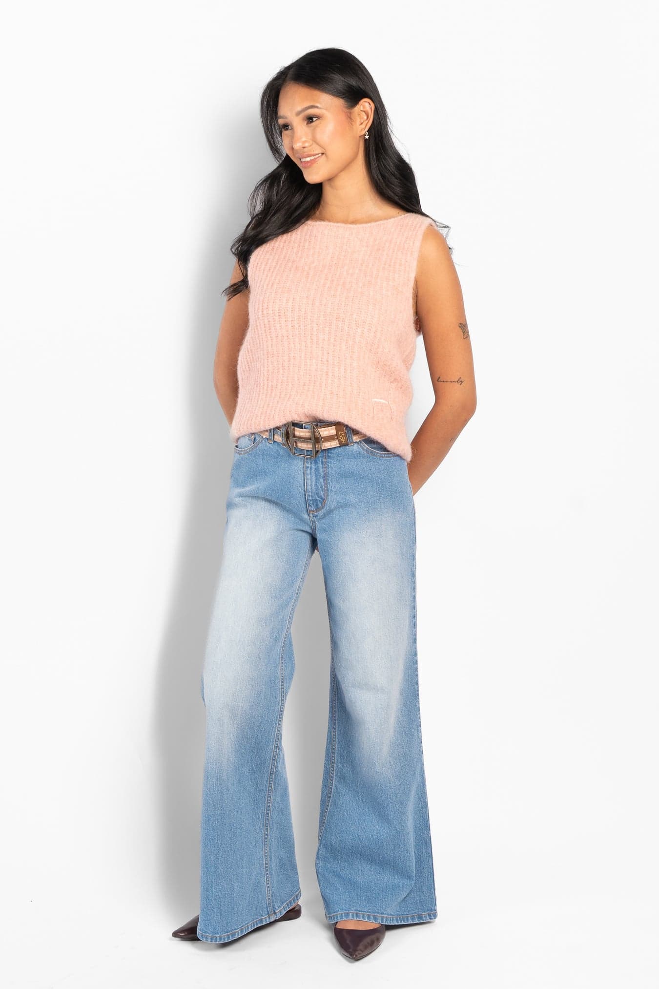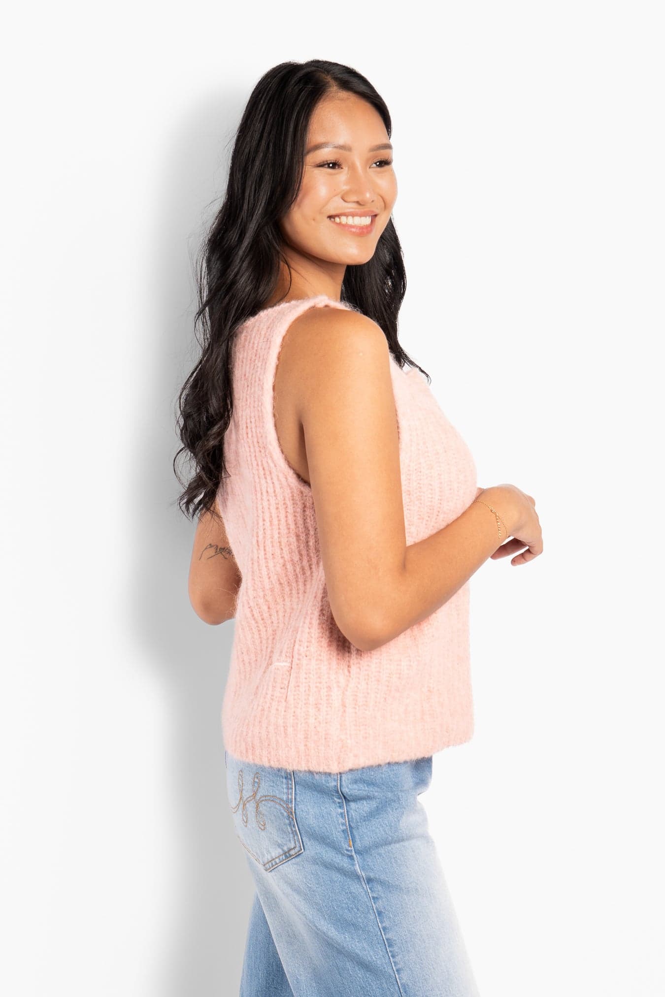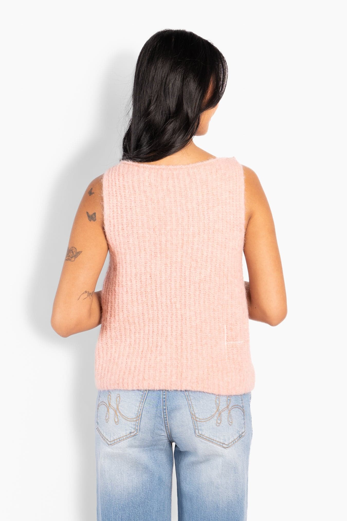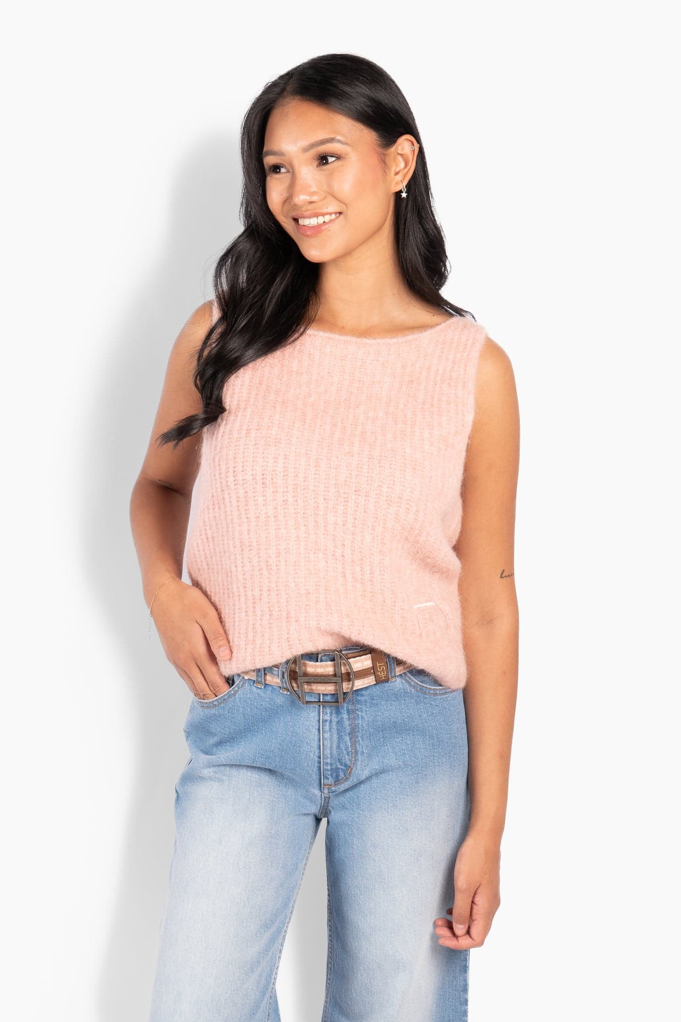 Adrienne Top er en myk, strikket topp med en ren, ermeløs silhuett og en lett og luftig følelse. Laget i en eksklusiv alpakkablanding som gir varme uten tyngde og en naturlig tekstur.