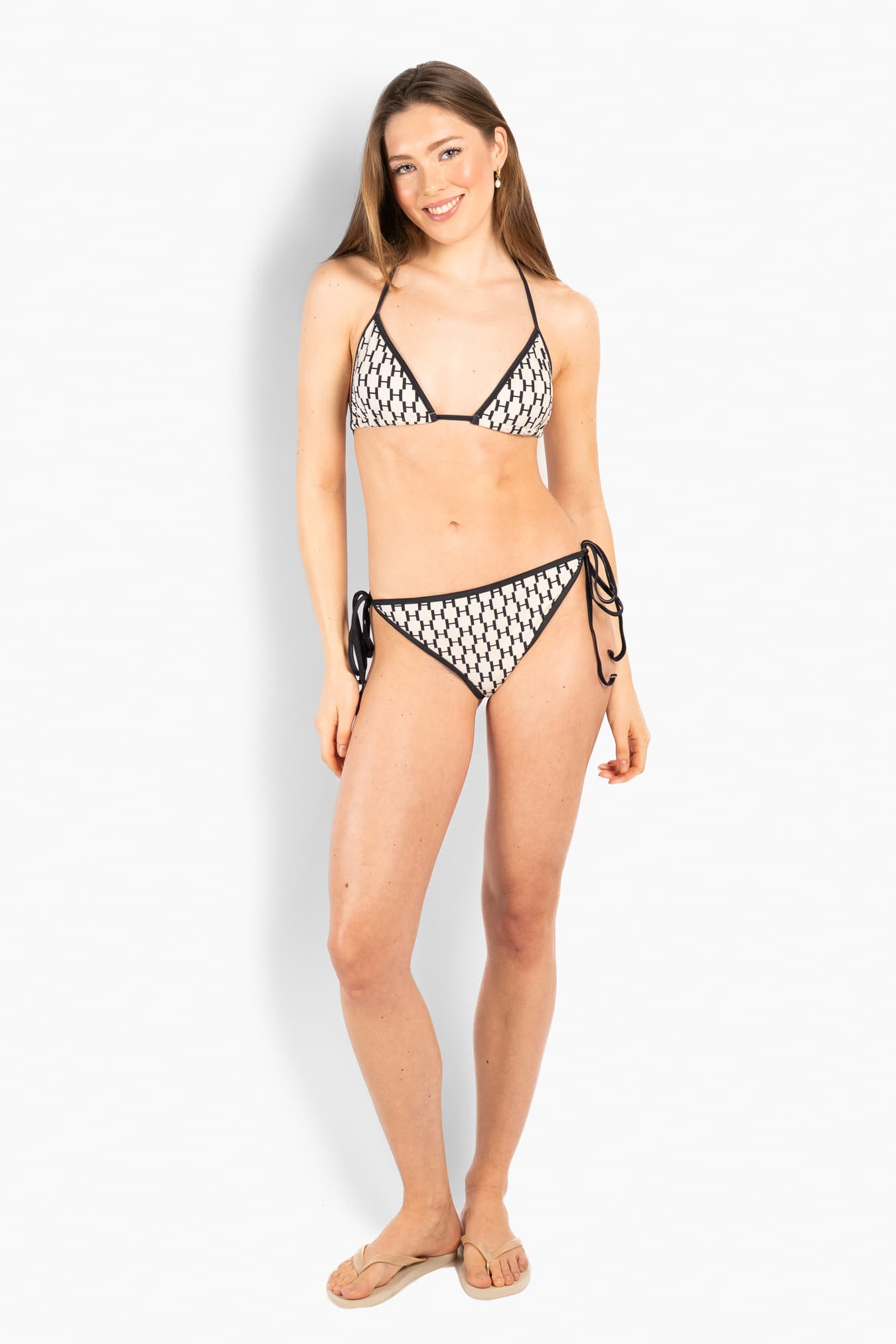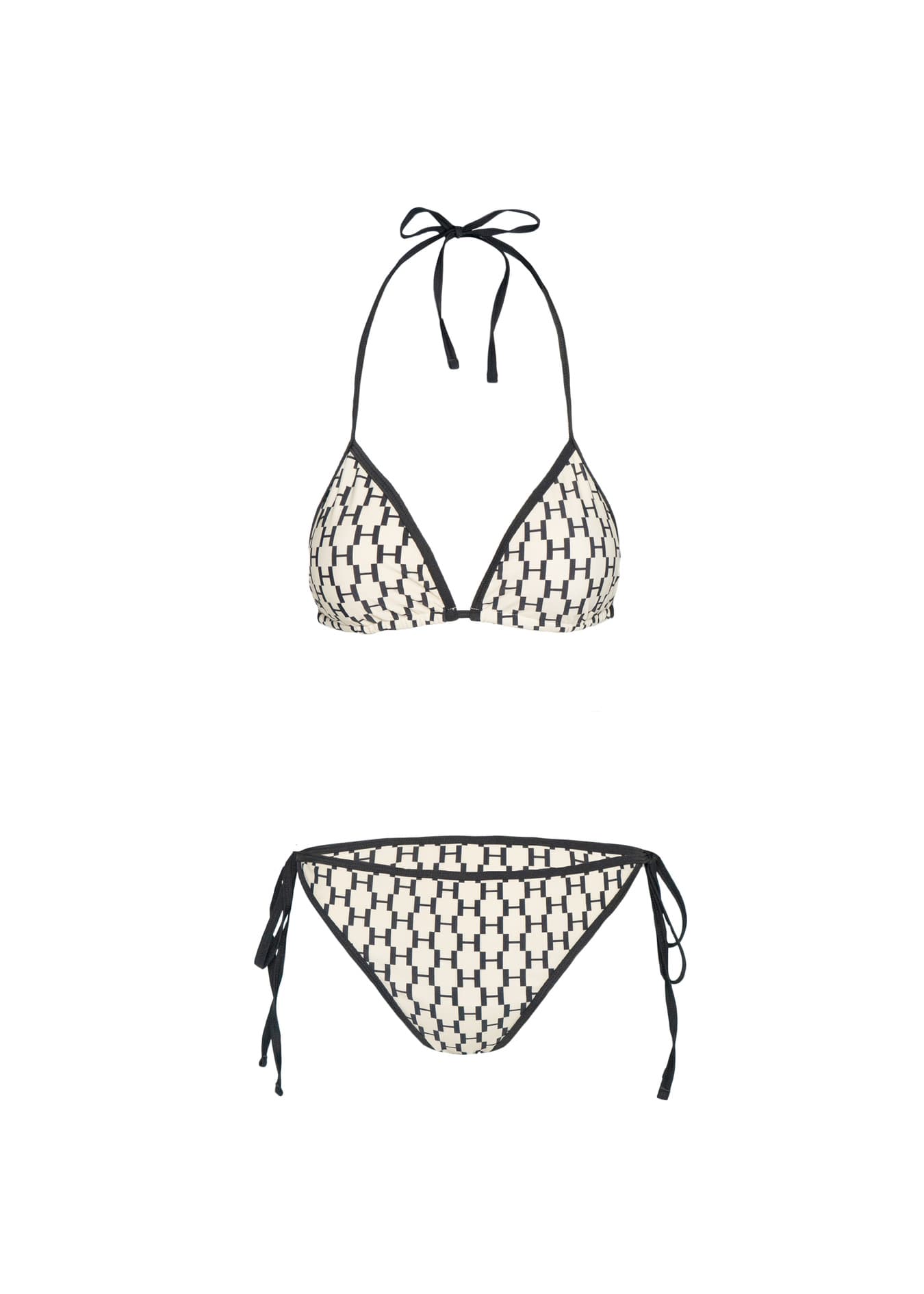 Denne trekantbikinitoppen har en ren og feminin silhuett. Justerbare knytinger i nakke og rygg gir fleksibel passform og en flatterende fasong. Det karakteristiske HÉST-inspirerte mønsteret kombineres med kontrastkanter som gir et tydelig og gjennomført uttrykk. Den er laget i et mykt og elastisk materiale som sitter komfortabelt på kroppen. En tidløs favoritt til sommergarderoben. Styles med matchende bikinitruse for et komplett sett, selges separat.