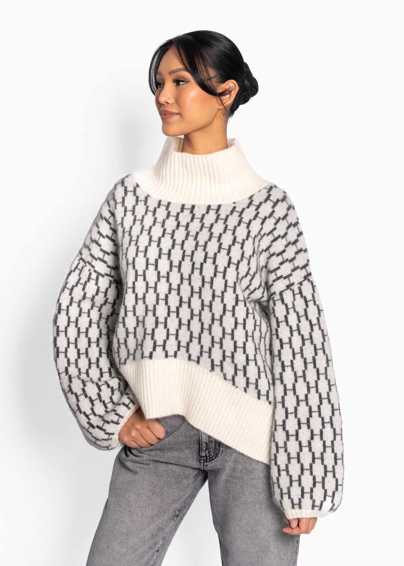 FAM Short Sweater - En moderne vri på vår originale bestselger. Den korte varianten har samme oversized passform, høye hals og vide ermer, men i en litt kortere silhuett som gjør den enkel å style til enhver anledning. Velg mellom sesongens farger Winter Moss, Light Beige Melange, eller alltid-på-lager-fargene, Black og White.